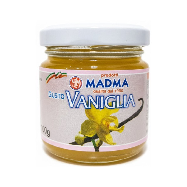 Preparato in pasta al gusto di vaniglia in barattolo da 100 g di Madma, ideale per aromatizzare ripieni per pralineria, creme, mantecati di gelateria e semifreddi.