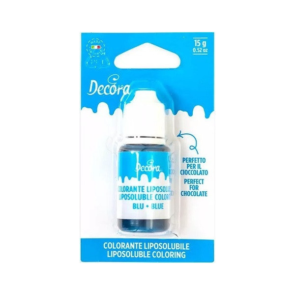 Colorante liposolubile liquido blu uso alimentare in bottiglia da 15 g di Decora. Particolarmente indicati per colorare il cioccolato o panna e creme al burro,