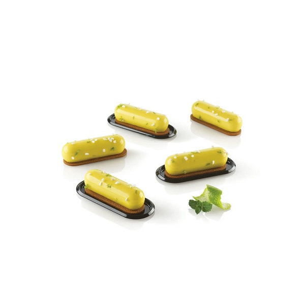 Kit Truffle Eclair 75 Silikomart: stampo silicone per 8 Strisce Eclair 130x31 alti 28 mm + cutter per inserti e basi, kit ideale per pasticcini rettangolari di eleganti sfere.