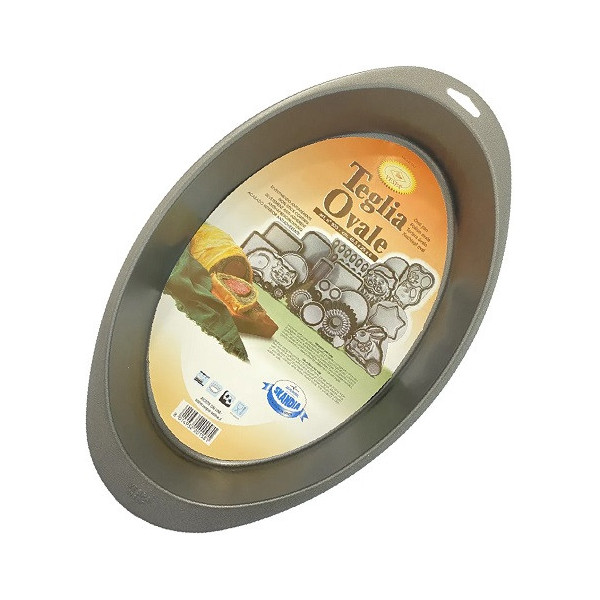 Teglia Ovale Teflonata: teglia da forno, a forma ovale, lunga 40,5 cm, larga 25 cm, alta 6 cm in alluminio antiaderente, da Vespa dolci forme.