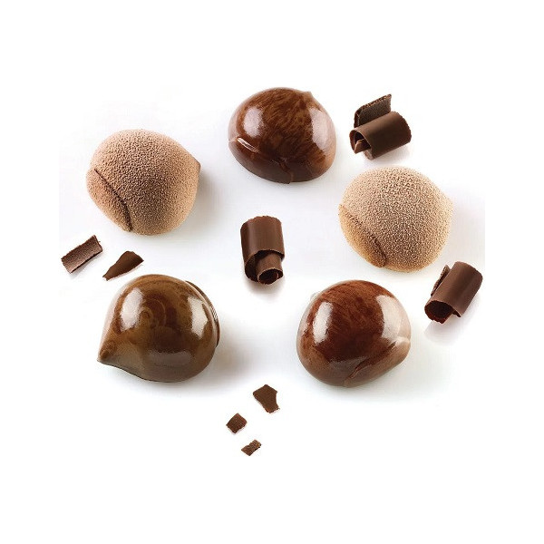 Stampo Marron Glacé 30 o 110 ml silicone bianco 3D, con cutter in plastica, da Silikomart, per semifreddi mousse e dolci mini porzione o monoporzione a forma di castagne.