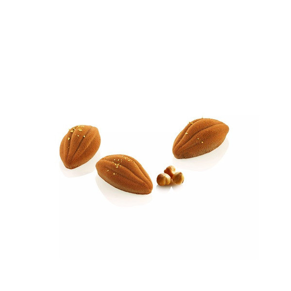 Stampo Nocciola 125 di Silikomart: kit composto da stampo in silicone, dal diametro 5.9 cm, altezza 6,2 cm con 5 cavità (linea Top white, effetto 3D) con supporto in plastica per facilitarne l’utilizzo