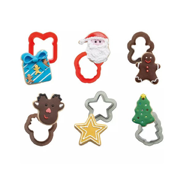 Mini taglia-biscotti Natalizi: 6 mini stampi in plastica ideali taglia-biscotti a forma di pacco regalo, stella, omino di pan di zenzero, albero di Natale, testa Babbo Natale e di renna da Decora.