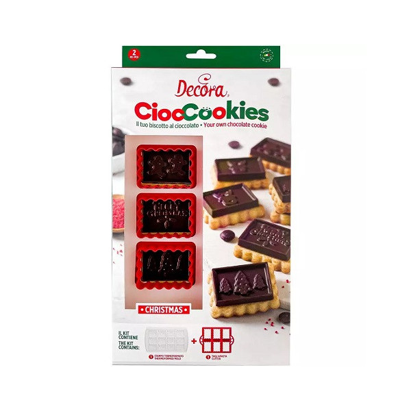 Set CiocCookies di Natale per galletta al cioccolato: tagliapasta in plastica per la base rettangolare a biscotto e stampo termoformato per placchette di cioccolato con decori natalizi, da Decora.