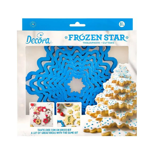 Albero Stella di ghiaccio o Frozen Star: 8 stampi in plastica ideali taglia-biscotti di dimensioni a partire da 4,5 cm a 26,5 cm, altezza 2,2 cm, da Decora.