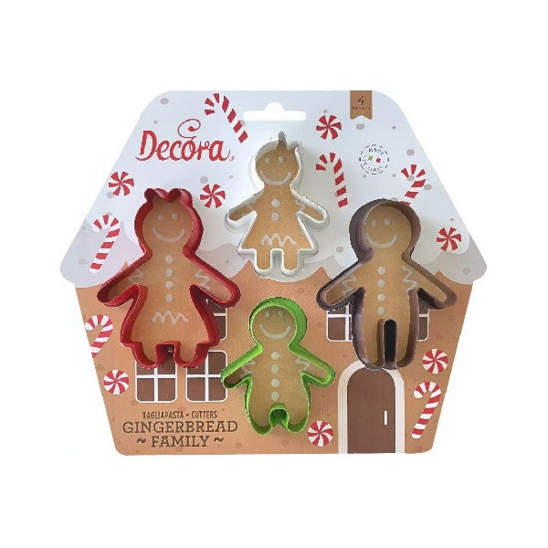Gingerbread family Decora la famiglia di pan di zenzero: set 4 stampi in plastica ideali taglia-biscotti di 2 dimensioni piccoli da 6x8 cm e grandi 11x8 cm, altezza 2,2 cm, da Decora.