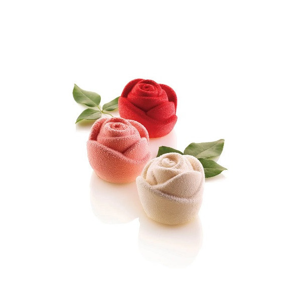 Stampo Rosa 145, in silicone bianco Top White, flessibile e antiaderente, ideale per creare 6 dolci a forma di rosa di diametro 7 cm, altezza 5,5 cm da Silikomart.