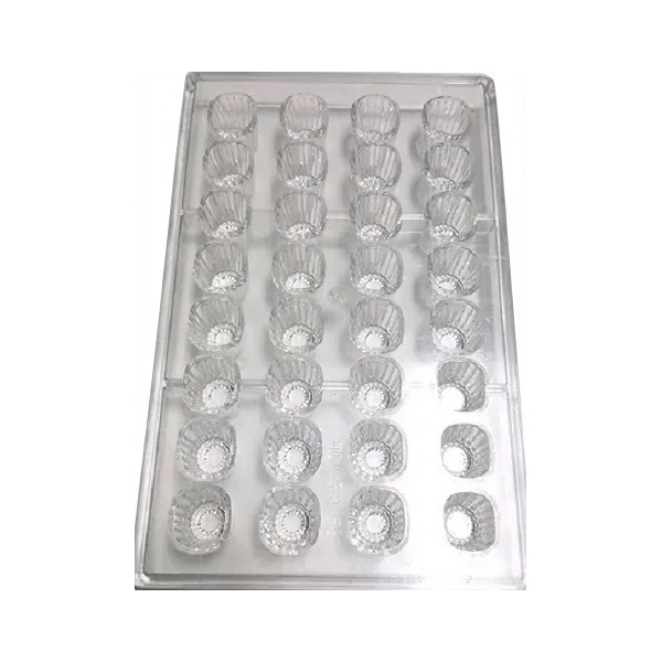 Stampo cioccolato, in policarbonato per 24 cioccolatini a forma cialda tonda con decoro cabossa dal peso di 3 g, diametro 2,9 cm, altezza 0,4 cm, in policarbonato.