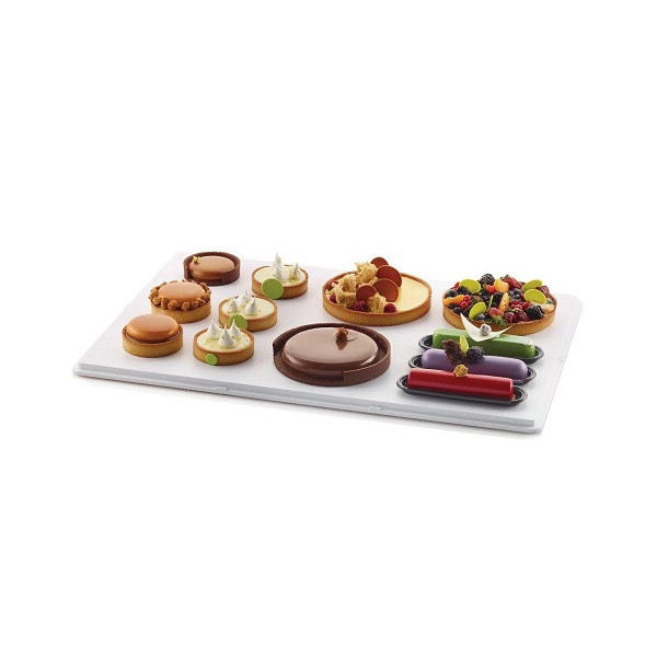 Vassoio o tavoletta cake board Silikomart in plastica Bianca 60 x 40 cm, priva di bordi. Ideale per la lavorazione, l'esposizione e lo stoccaggio in abbattitore di gelati e monoporzioni.