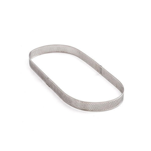 Stampo ad anello a forma ovale, in acciaio inox microforato, ideale per multi-porzioni o basi per torte crostate ovali di dimensioni 29x12xh3,5 cm da Decora. Ideale anche come tagliapasta ovale.