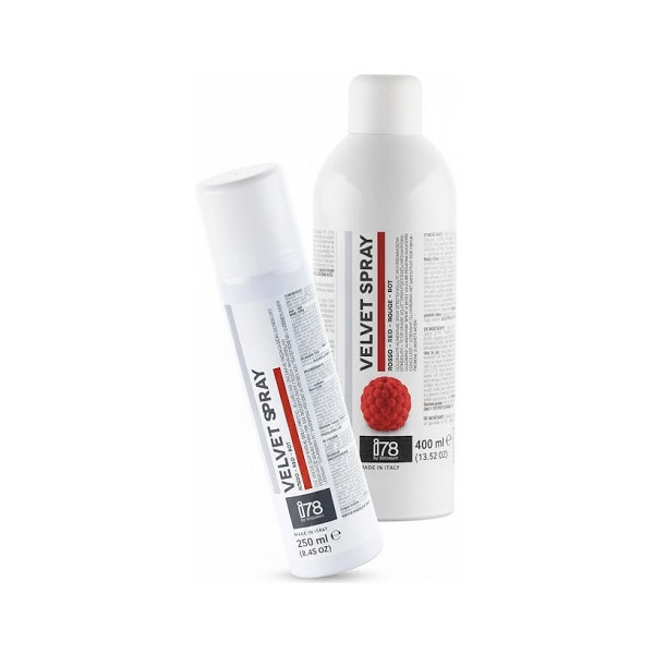Velvet Spray Red 200 o 400 ml linea i78 da Silikomart: burro di cacao spray, colorante spray rosso effetto velluto, ideale per decorare preparazioni congelate