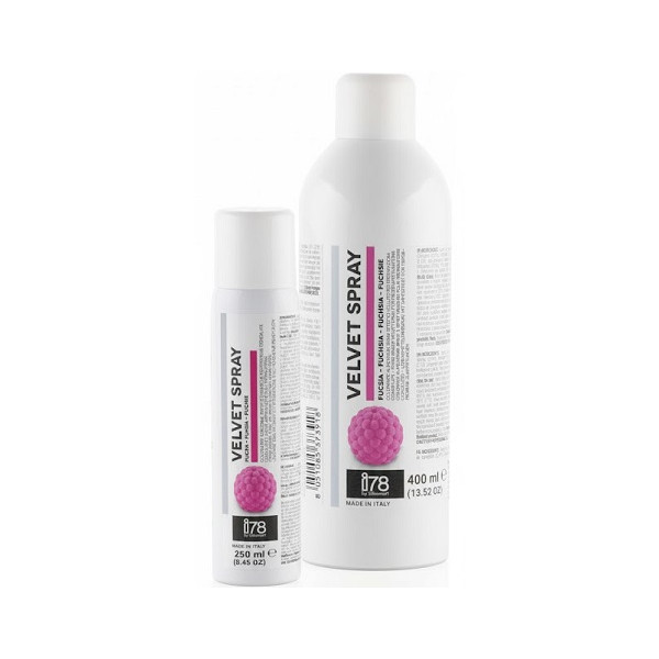 Velvet Spray Fuchsia 200 o 400 ml linea i78 da Silikomart: burro di cacao spray fucsia effetto velluto, per uso alimentare, ideale per decorare preparazioni congelate, linea i78 da Silikomart