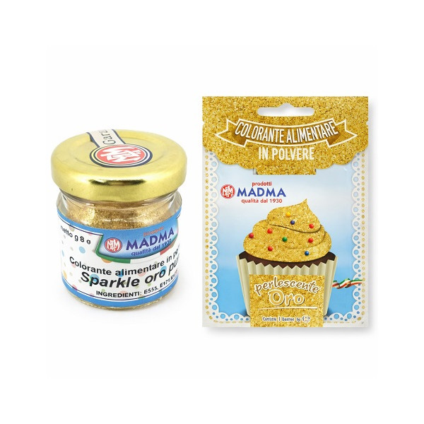Colorante in polvere Sparkle Oro Puro o brillante o scintillante, idrosolubile e concentrato in bustina da 3 g o barattolo da 8 g, di Madma. Ideale per pasta di zucchero, ghiaccia, panna e creme.