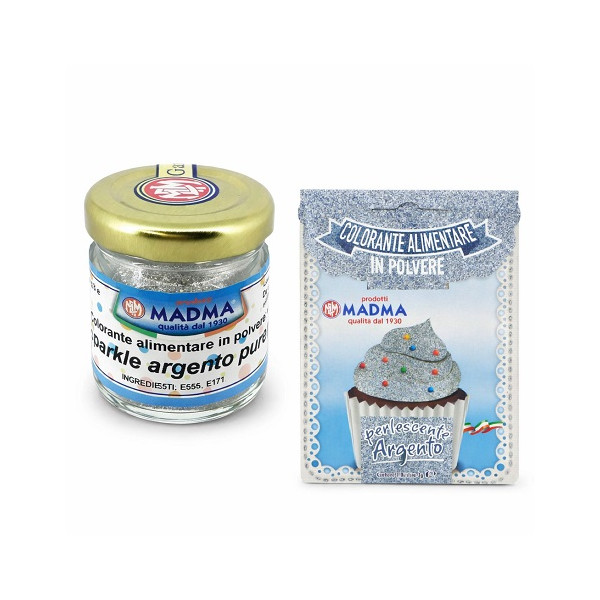 Colorante in polvere Sparkle Argento Puro o brillante o scintillante, idrosolubile e concentrato in bustina da 3 g o barattolo da 8 g, di Madma. Ideale per pasta di zucchero, ghiaccia, panna e creme.