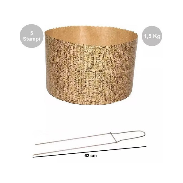 Set spillone in acciaio lungo 62 cm con 5 stampi panettoni artigianali bassi, stampi canasta o stampi panettoni gastronomici in carta cellulosa usa e getta o monouso da 500 g