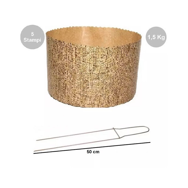 Set spillone 50 cm in acciaio con 5 stampi panettoni artigianali bassi, stampi canasta o stampi panettoni gastronomici in carta cellulosa usa e getta o monouso da 1 kg