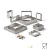 Stampo ad anello quadrato in acciaio micro-forato per monoporzioni di lato 7 o 10 cm ed h 2 o 3,5 cm da Decora. Fascia o sagoma quadrata ideale per realizzare basi per crostatine o come cutter o tagliapasta