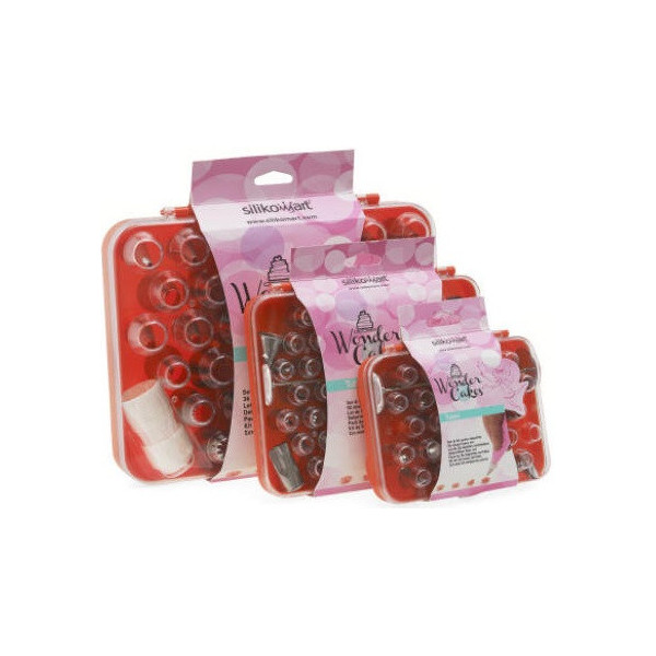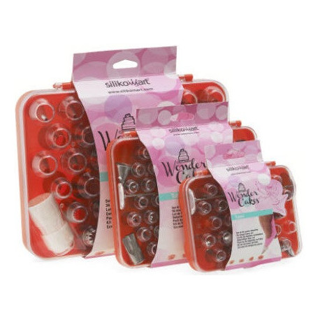 Set da 26 a 52 bocchette per decorazione in acciaio inox Silikomart: scatola completa di beccucci punte o bocchette ed adattatori per sac à poche in acciaio inox