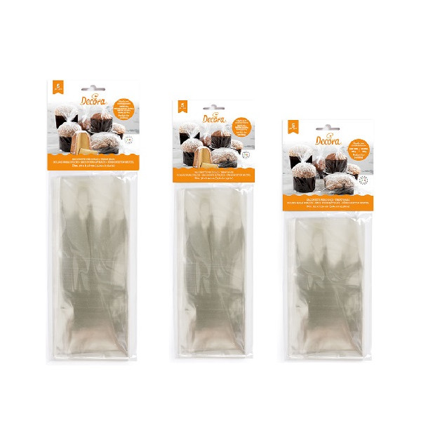 5 Sacchetti per dolci da 25 a 40 cm di Decora: buste cast neutre trasparenti, in plastica per alimenti, perfette per dolci artigianali, ogni tipo di prodotto dolciario, per confezionare lievitati e ogni genere di delizia. Consigliato per panettone, pandoro e colomba.