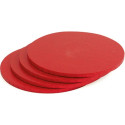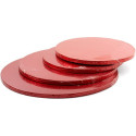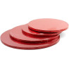 Base o vassoio sottotorta tondo rosso di lato da 20 cm a 40 cm ed altezza 1,2 cm, in pasta di cellulosa rivestite con alluminio colorato per alimenti ed imbustati singolarmente.