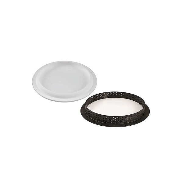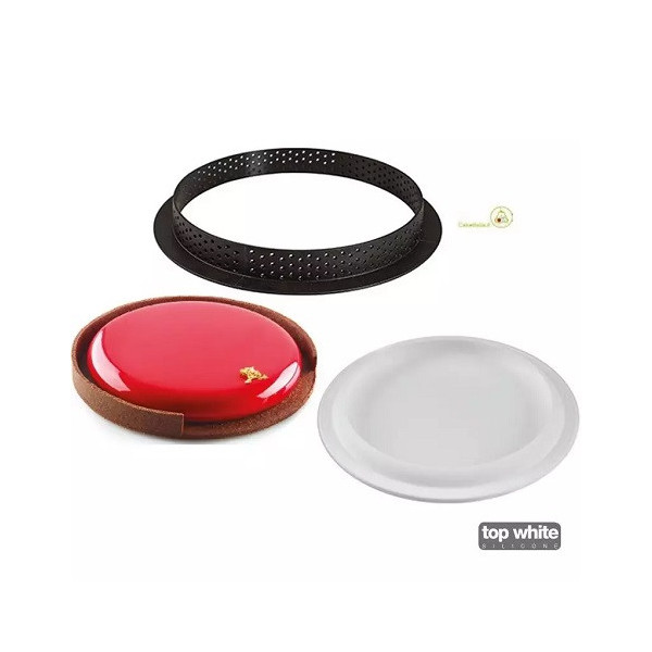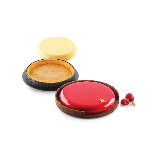 Kit Tarte Ring Round Silikomart è un set composto da 1 anello tondo microforato per la base della crostata e 1 stampo in silicone bianco per una mousse o un cremoso disponibile di:
