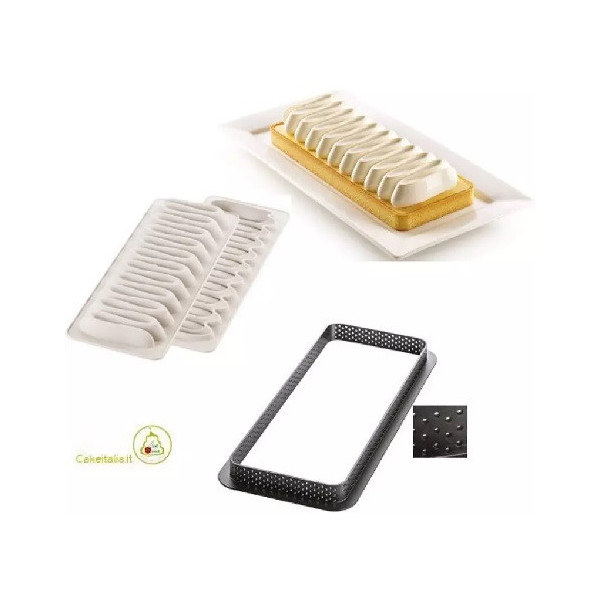 - uno stampo in silicone con una cavità, da 24 cm x 8 cm h 24 mm per realizzare una delicata decorazione ondulata da adagiare sopra alla pasta frolla.
