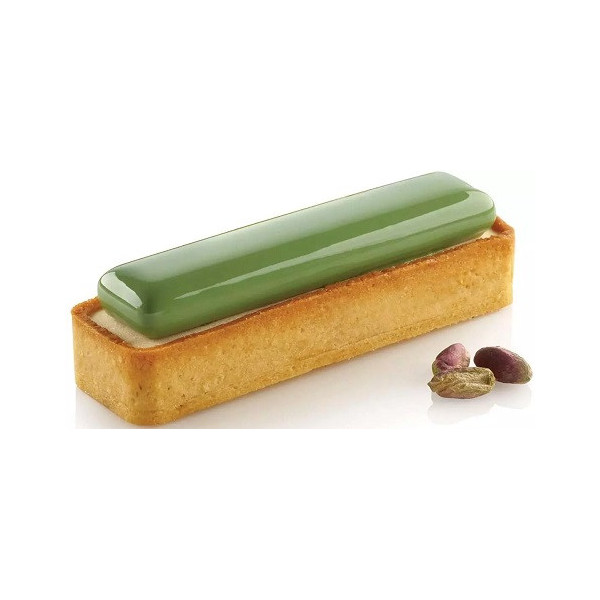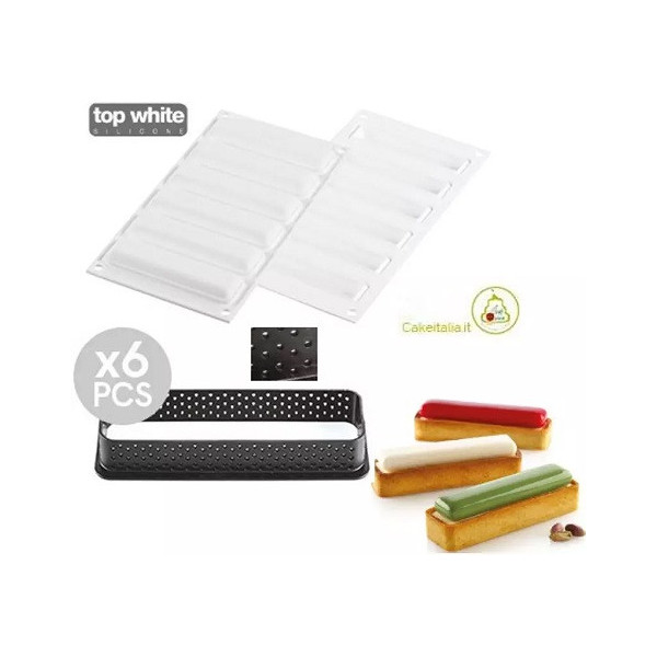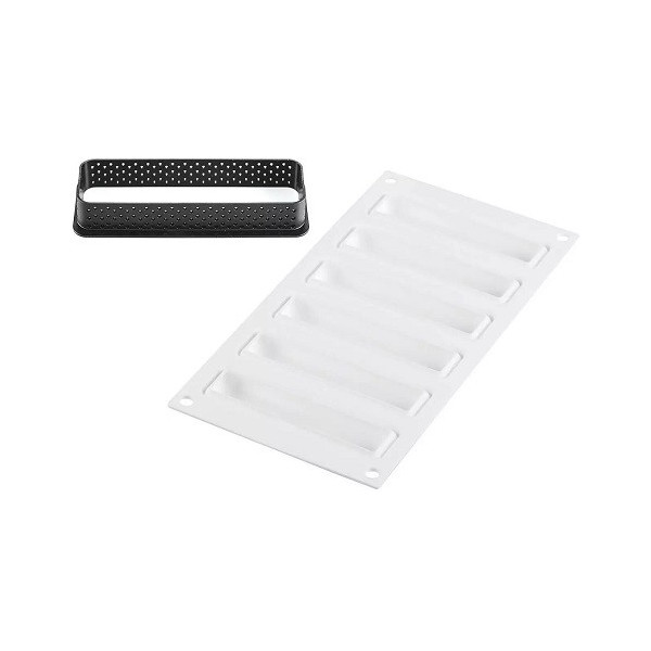 - 1 stampo in silicone con 6 cavità rettangolari da 10,7 cm per realizzare le mousse o i cremosi da adagiare sopra alla pasta frolla.