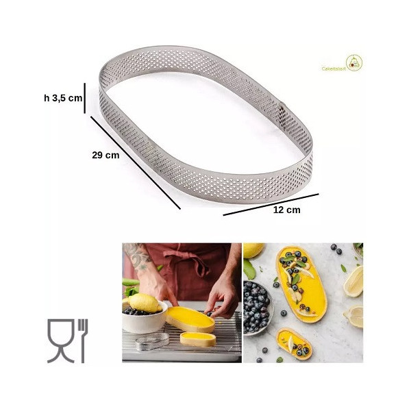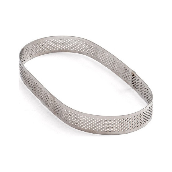 Stampo ad anello a forma ovale, in acciaio inox microforato, ideale per multi-porzioni o basi per torte crostate ovali di dimensioni 29x12xh3,5 cm da Decora. Ideale anche come tagliapasta ovale.