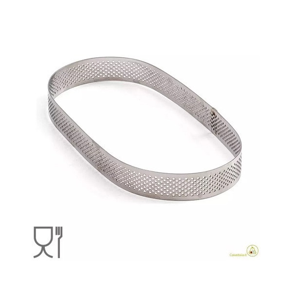 Sagoma, fascia o stampo ad anello a forma ovale di dimensioni lunghezza 20 cm, larghezza 12 cm ed altezza 3,5 cm, in acciaio microforato da Decora.