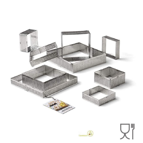 Stampo ad anello quadrato in acciaio micro-forato per multi-porzioni di lato 15 o 20 cm ed h 2 o 3,5 cm. Fascia o sagoma quadrata ideale per realizzare basi per crostate o come cutter o tagliapasta.