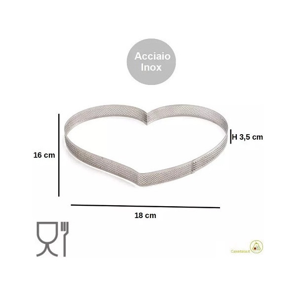Con lo stampo ad anello a cuore da 18 cm per torte o Crostate a cuore da Decora puoi realizzare crostate di 18 cm x 16 cm. L'anello micro-forato a forma di cuore in acciaio inox micro-forato, antiaderente, indeformabile adatto all'uso in forno fino a 180°C per la realizzazione delle basi, puoi usarli anche come tagliapasta o cutter a cuore da 18 cm