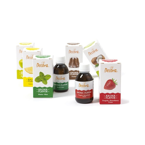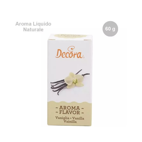 Aroma liquido alimentare naturale alla vaniglia, da utilizzare sia in cottura che a freddo, perfetto per aromatizzare impasti e creme di dolci e torte in flaconi da 60 g da Decora