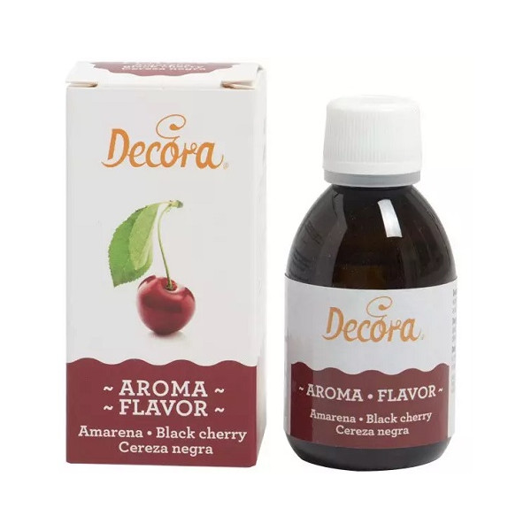 Aroma Amarena di Decora, confezionato in bottiglia da 50 g con tappo a chiusura ermetica, ideale per aromatizzare l'impasti, creme da utilizzare sia in cottura che a freddo.
