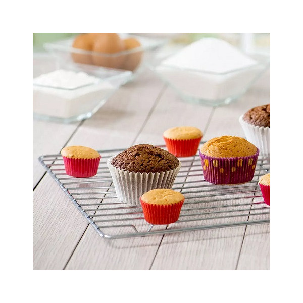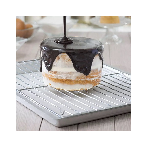 Griglia raffredda torte e di colaggio a trama larga, di forma rettangolare, in metallo antiaderente, di dimensioni 30,4 x 45,4 cm, da usare per raffreddare preparazioni dolci e salate.
