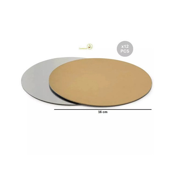 Set 12 Dischi Sottotorta Piccoli Accoppiati Oro e Argentato da Decora. formati Ø13 o Ø16 cm, spessore 0,15 cm. Cartoncino sottile e rigido, con entrambe le facce ricoperte di una pellicola in PET impermeabile.