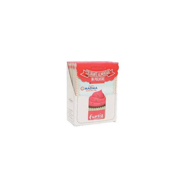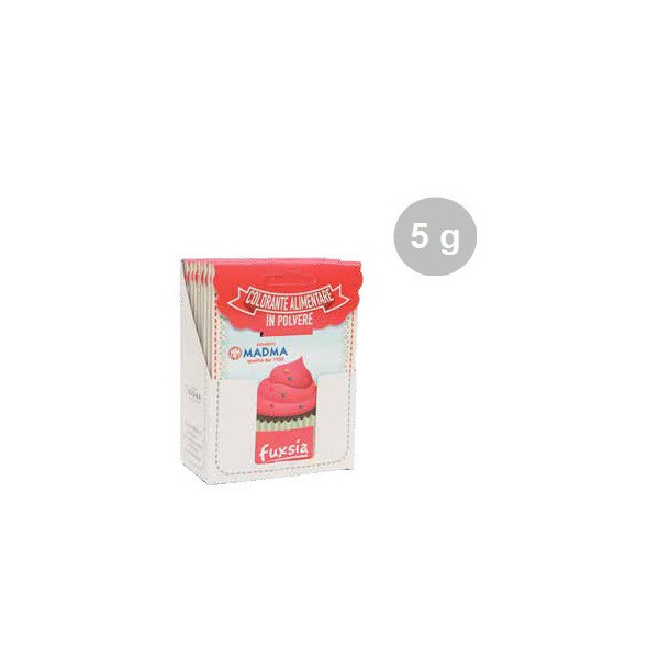 Colorante alimentare in polvere idrosolubile fucsia, concentrato, in bustina da 5 g, di Madma. Ideale per colorare pasta di zucchero, ghiaccia, panna e creme.