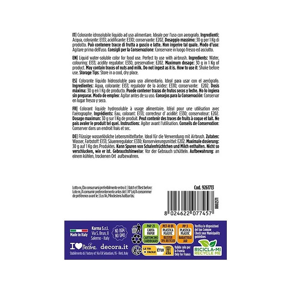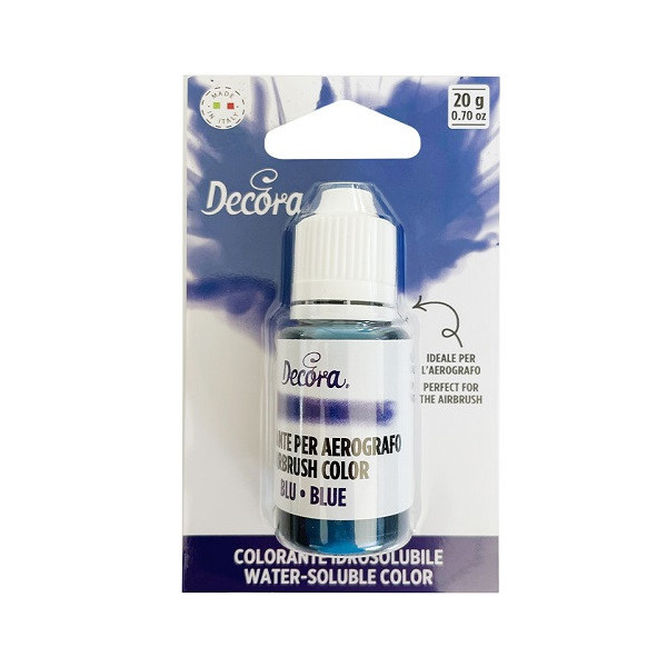 Colorante idrosolubile liquido blu, ad uso alimentare, in bottiglia da 20 g, di Decora. Ideale per aerografo, per colorare e decorare dolci.