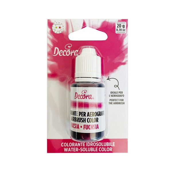 Colorante idrosolubile liquido fucsia, ad uso alimentare, in bottiglia da 20 g, di Decora. Ideale per aerografo, per colorare e decorare dolci.