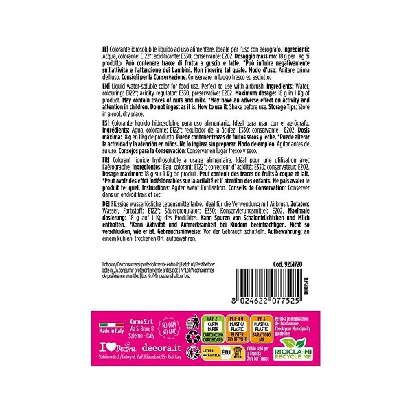 Caratteristiche colorante idrosolubile fucsia Decora: