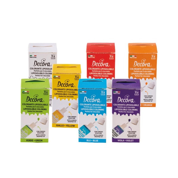 Colorante liposolubile liquido bianco uso alimentare in bottiglia da 15 g di Decora. Particolarmente indicati per colorare il cioccolato o panna e creme al burro