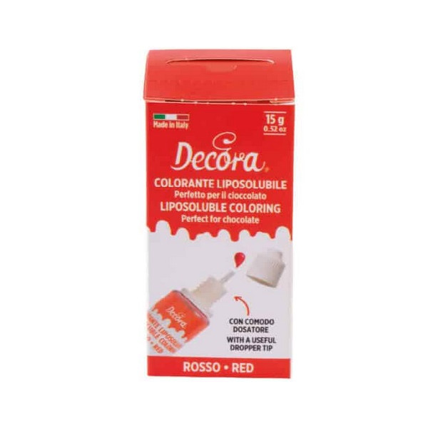 Colorante liposolubile liquido rosso uso alimentare in bottiglia da 15 g di Decora. Particolarmente indicati per colorare il cioccolato o panna e creme al burro,