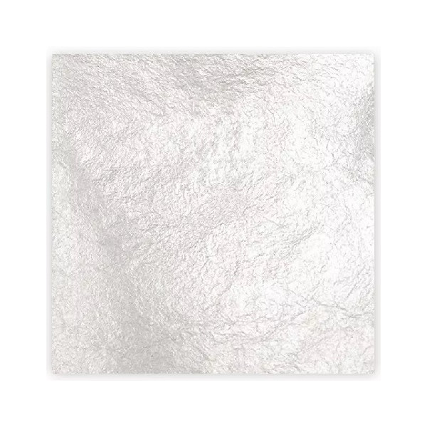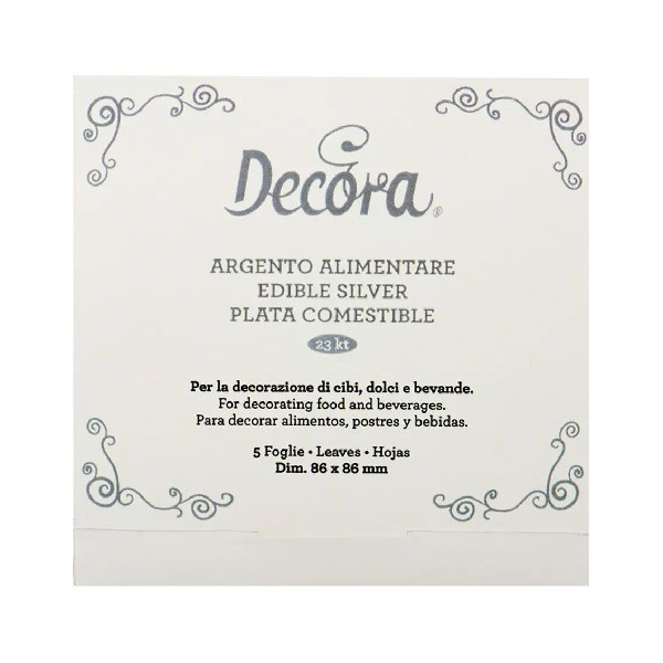 5 Fogli argento alimentare da 23 carati, 0,08 g, di lato 86 x 86 mm, pronti all'uso, commestibili e dal gusto neutro, da Decora. Foglie oro ideali per creare preziose decorazioni e dettagli pregiati.