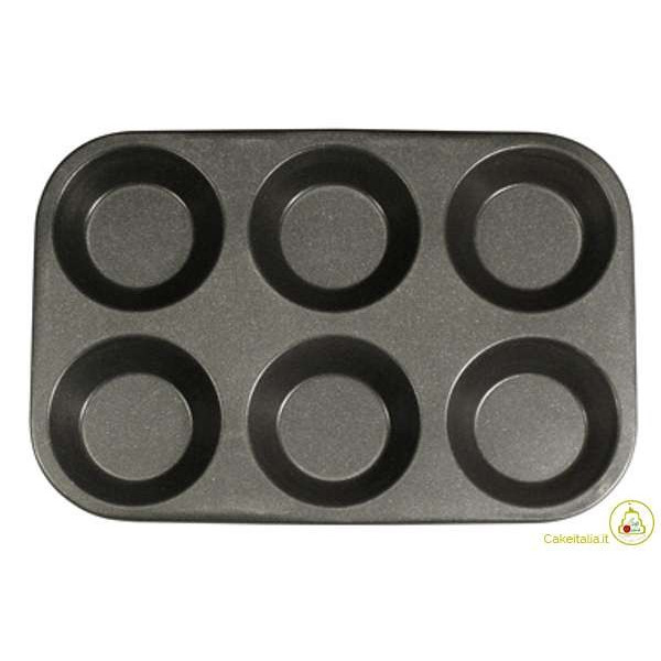 Stampo Plateau in alluminio antiaderente per 6 formine lisce, muffin basso, dal diametro 8,5 cm x altezza 1,6 cm, ideale per Tortine, Tartellette o Mini-Cake.