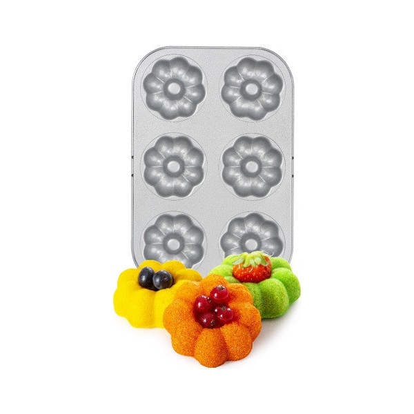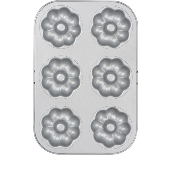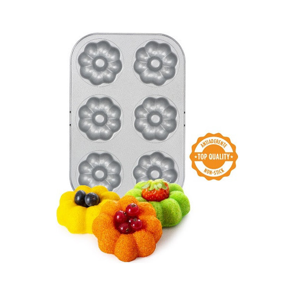 La teglia in acciaio ad alto spessore ed anti-aderenza per 6 ciambelline a forma di fiore è uno stampo a forma di Plateau con 6 cavità.