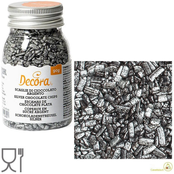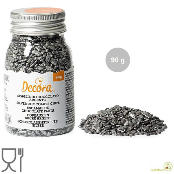 Piccole scaglie di cioccolato color argento, pronte all'uso da cospargere direttamente sulle tue creazioni, in barattolo da 90 g da Decora.