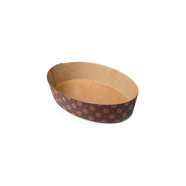 Set da 25 stampi da forno ovali 230×155×50 mm, ideali per torte artigianali da 500 g. Realizzati in carta cellulosa calandrata monouso, sono resistenti a oli, congelamento e alte temperature fino a +220 °C. I decori floreali color oro sono stampati con inchiostri idonei al contatto alimentare e resistenti al calore e alle sostanze alcoliche.