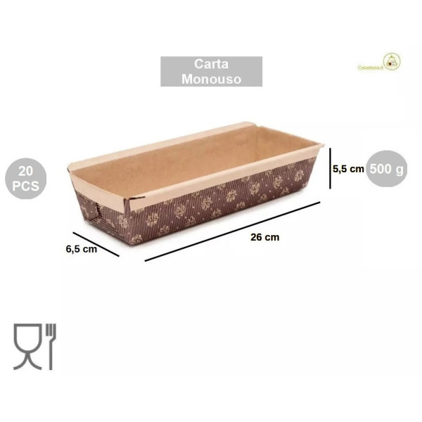 20 Stampi in carta cellulosa per torte plum-cake, di lunghezza 26 cm, larghezza 6.5 cm, altezza 5,5 cm. Gli stampi in carta forno usa e getta o monouso sono ideali per torte plumcake da 500 g