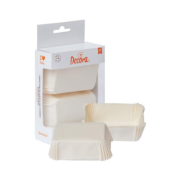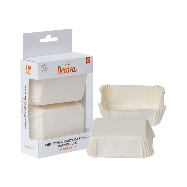 36 Pirottini bianchi per mini plum cake in carta forno antiaderente, resistente fino a 220 °C, lunghi 8 cm, larghi 5 cm, alti 3,2 cm da Decora. Ideali per cuocere e presentare mini plum-cake e dolcetti.