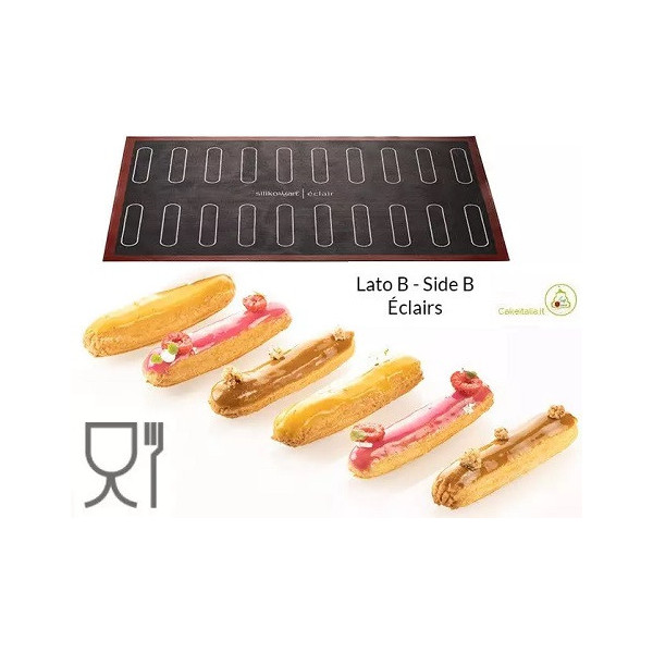 Grazie alle impronte riportate su entrambe le facce questo tappeto per cottura micro-forato in Silicone è ideale sia per la cottura di mini éclair (lato A) ed éclairs (lato B), ma anche biscotti, petits-fours, pane e pizza.