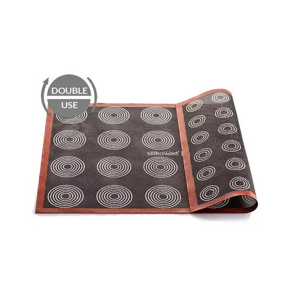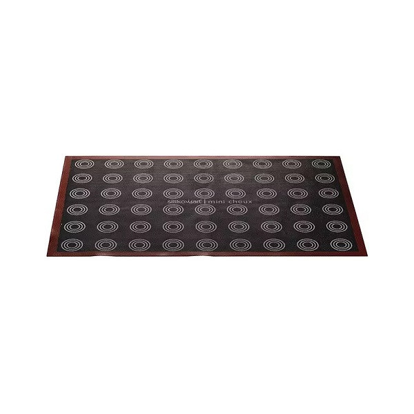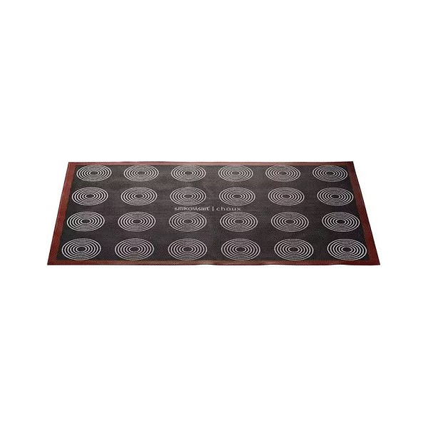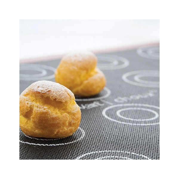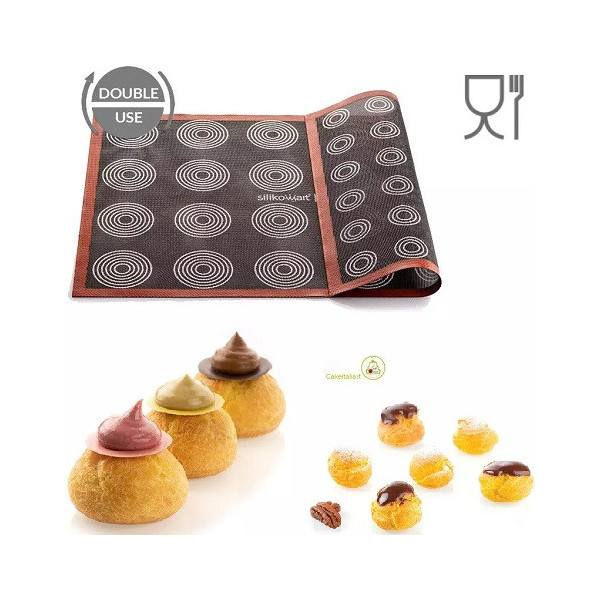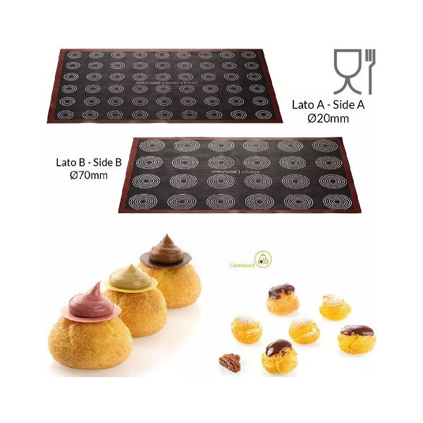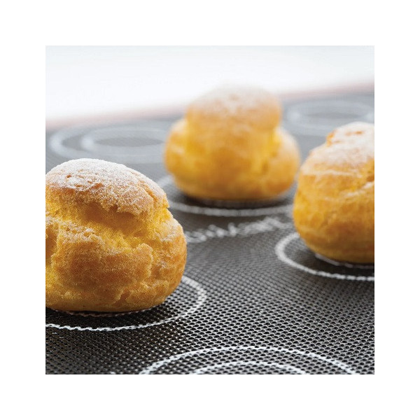 Grazie alle impronte riportate su entrambe le facce questo tappeto per cottura micro-forato in Silicone è ideale sia per la cottura di mini choux (lato A) ed choux (lato B), ma anche biscotti, petits-fours, pane e pizza.
